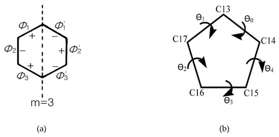 The conformational analysis of the A, B, and C steroid rings has been accomplished based on the asymmetry parameter ΔCs, which is defined in Equation (5) [46], where and represent the symmetry related torsion angles and m represents the pair numbers of torsion angles (Figure 12a). They have alternate opposite signs. For steroids, the torsion angle is considered as the angle corresponding to the common side between C and D rings.