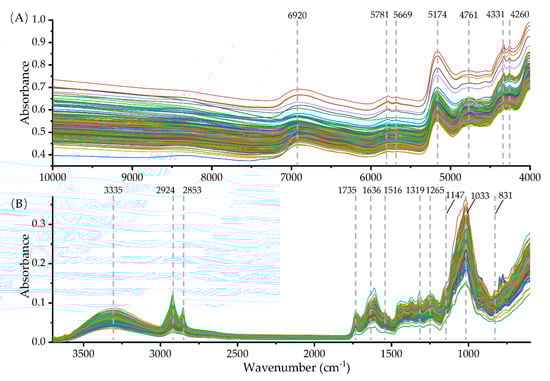 Raw near-infrared (NIR) (A) and Fourier transform mid-infrared (FT-MIR) (B) spectra of 180 samples of G. rigescens and its related species.