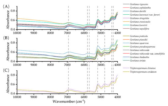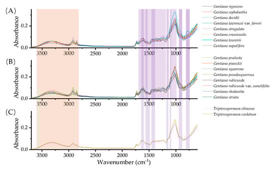 Averaged FT-MIR spectra of 18 Gentiana (A), (B), and Tripterospermum species (C).