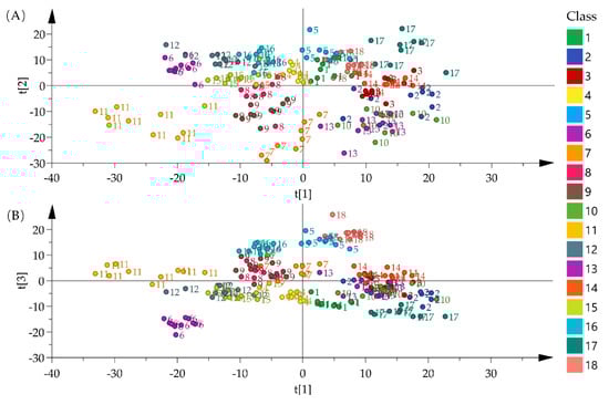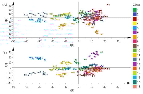 Score plots of PCA for 180 samples using FT-MIR spectra after pretreatment (A) score plot of PC1 vs. PC2, (B) score plot of PC1 vs. PC3. The meaning of the codes (1–18) could be found in the sample information.