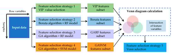 Feature selection (“optimal wavenumbers” for classification modeling) is a critical step in the modeling process [72]. There might be some irrelevant or noisy features in data sets because of the infrared techniques provide multivariate and non-specific signals [72,73]. Feature selection of NIR and FT-MIR subsets was based on five methods. The first four were VIP (features were selected by the PLS-DA combined with VIP value) [49], Boruta (features were selected by the Boruta algorithm) [49], GARF (features were selected by the genetic algorithm combined with RF model), and GASVM (features were selected by the genetic algorithm combined with SVM model) [50]. The last was Venn, which feature variables were the intersection of the results of the first four feature selection.