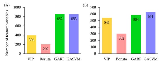 Size of feature variables of the four algorithms (A) feature selection of NIR spectroscopy, (B) feature selection of FT-MIR spectroscopy.