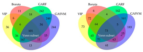 It is necessary to screen out the most relevant chemical information for classification with specific variables selection methods in order to improve the classifier performance. In the study, five methods were used to feature selection (Figure 6). Firstly, VIP (variable importance in projection), Boruta, GARF (genetic algorithm combined with random forest), and GASVM (genetic algorithm combined with support vector machine) were applied to select feature variables [49,50]. Secondly, the intersection of feature variables that were selected by these four algorithms was calculated and the result was the fifth approach of feature selection (Venn selection). Figure 7 displays the number of feature variables of each selection method. Further analysis by Venn diagram found that 101 NIR variables and 73 FT-MIR variables were common characteristic variables of the four selection methods, respectively (Figure 8). Those variables were 6.79% and 6.01% of the full NIR spectrum and full FT-MIR spectrum, respectively. In the final, 10 feature subsets were established. They were the VIP-NIR, Bor-NIR, GARF-NIR, GASVM-NIR, Ven-NIR, VIP-MIR, Bor-MIR, GARF-MIR, GASVM, and Ven-MIR subset.