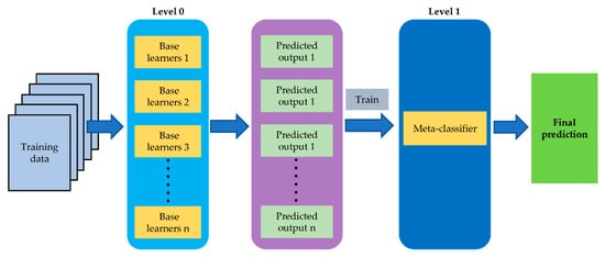 In our study, the first level (level-0) of stacking model is composed of several weak classifiers (base learners 1, base learners 2, base learners 3, base learners n) [45]. Subsequently, the predicted probabilities of basic learners are used to train the second level model (final model) [45]. Figure 9 shows the schemes for stacked generalization.