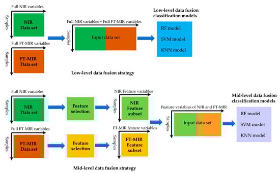 Low-level data fusion, as its name suggests, subsets are straightforwardly concatenated and reconstitute an independent data matrix. Subsequently, the new dataset is used to establish the classification models [53]. In the case of mid-level data fusion, classification models were established by a new data set, which were formed by concatenating the feature important variables from a subset by different feature selection algorithms [53]. In the research, the low- and mid-level data fusion strategies were considered. Additionally, Figure 10 shows the schemes for data fusion strategies.