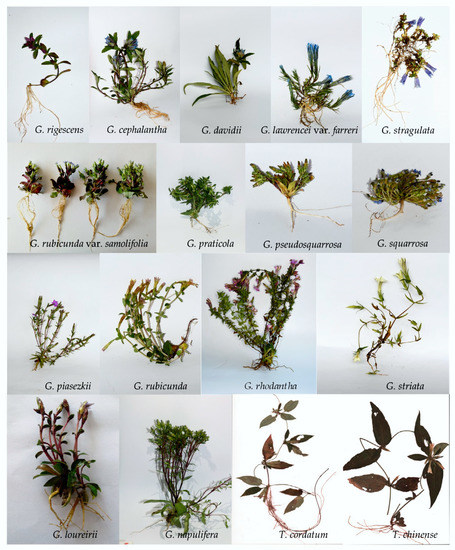 Genus Gentiana is one of the largest groups in Gentianaceae, comprising 360 species that are widespread across Northwest of Africa, Europe, America, East of Australia, and Asia [1]. Many species of this genus have significant economic value and they are widely used by the food and pharmaceutical industries in the world [2,3,4]. In Europe, G. lutea (Yellow Gentian) are traditional materials for alcoholic bitter beverages and have a function of being appetite stimulating and improving digestion [4,5]. In Asia, Gentiana has a long history in use for medicine [2,3,6]. Places, including Iran, Mongolia, Japan and Korea have literature and details about nature and the of medicinal Gentiana plants found in these countries [3,7,8]. In China, species of Gentiana are diverse (about 248 species) and some of them have been an important part of traditional Chinese medicine (TCM) for a long time [1,9]. Approximattely 2000 years ago, Chinese Medicine monographs, “Shen Nong Ben Cao Jing”, had described and recorded function and medicinal value of Longdan (Gentianae Radix et Rhizoma: dried root and rhizome of G rigescens, G. trifloral, G. manshurica and G. scabra) and Qinjiao (Gentianae Macrophyllae Radix: dried root of G. macrophylla, G. straminea, G. crassicaulis, and G. dahurica) [10]. Presently, nine species of Gentiana have been recorded as the official drug of Pharmacopoeia of the People’s Republic of China (Ch.P. 2015 edition) [9]. But besides that, G. cephalantha, G. davidii, G. loureirii, G. rubicunda G, lawrencei var. farreri, and other species have been used as a popular herb in folk medicine and many other ethnomedicines for remedy digestive and respiratory illnesses [11,12,13]. Gentiana and its related species are extensively used for various health disorders due to the cheap price of traditional herbs [13]. These medicinal plants have always played an important role in the health care of local people, especially in the underdeveloped area of southwest China.