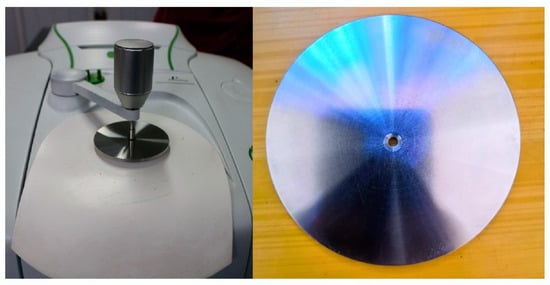 The FT-MIR spectrum was recorded using a FT-IR spectrometer (Perkin Elmer, Norwalk, CT, USA) that was equipped with a deuterated triglycine sulfate (DTGS) detector and a ZnSe ATR (attenuated total reflection) accessory (PIKE technologies, Inc. Madison, WI, USA). The spectral fingerprint of every sample was recorded bands from 4000–600 cm−1 while using a resolution of 4 cm−1 and an accumulation of 16 scans. The ATR accessory is equipped with a unique metal O-ring for sample holding in order to control the path length and thickness of the sample (Figure 12). In the beginning, the metal O-ring was placed on the reflection diamond of accessory, and then the sample powder was put on the central of O-ring metal. At last, a pressure tower on the top of the metal O-ring was used to press the powder tightly until a constant pressure (131 ± 1 bar on the scale of the micrometric pressure device) [60]. Before each measurement, a laboratory air spectrum was recorded and checked for remaining water and sample residues, as well as background deduction.