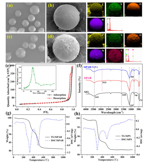 Relevant characterization: (a) SEM micrograph and EDX spectra for the prepared silica-supported primary amine resin (SiPAR) with a 250× magnification and (b) the corresponding EDS results with a 1000× magnification, (c) the SiPAR after V(V) adsorption with a 250× magnification and (d) the corresponding EDS results with a 1000× magnification, (e) the N2 adsorption-desorption isotherms and pore width distribution of the SiPAR, (f) FT-IR spectra of SiO2, SiPAR, and SiPAR-V(V) (PS: SiPAR-V(V) denotes the SiPAR after V(V) adsorption.), (g) TG-DSC curves of the SiPAR and (h) the SiPS.