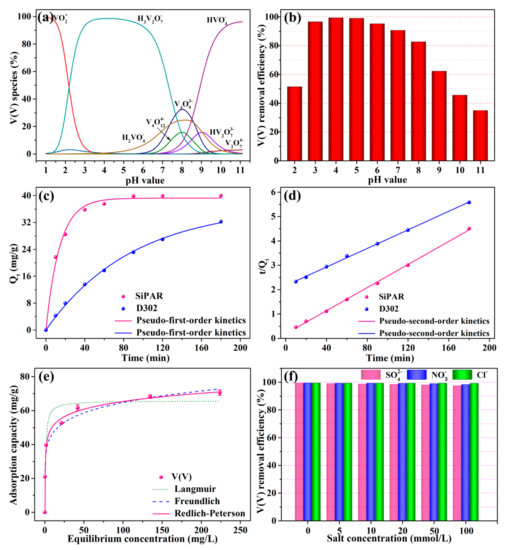 Batch adsorption experiments: (a) V(V) ionic species distribution at various pH with 100 mg/L total V(V) concentration, (b) removal efficiency of V(V) in the pH range from 2 to 11, (c) Pseudo-first-order kinetics and (d) pseudo-second-order kinetics fits for the V(V) kinetics data of the SiPAR and D302 resins, (e) V(V) adsorption isotherm onto the SiPAR, (f) effect of coexisting anions on V(V) removal efficiency of SiPAR (aqueous volume: 20 mL, resin mass: 0.05 g, T = 298 K). PS: V(V) form was calculated by PHREQQ, which is a software used to evaluate the speciation and proportion of complex chemicals in the solution.