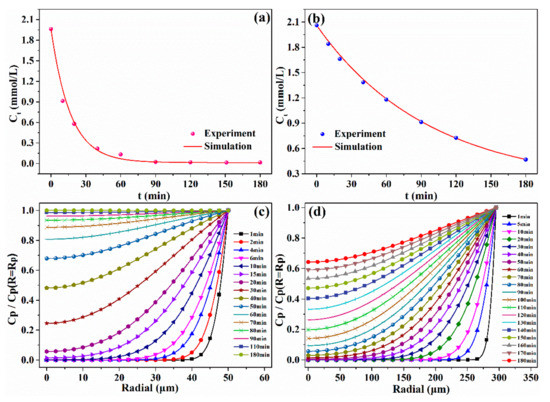 In batch experiments, the pseudo-first-order and pseudo-second-order kinetics models are commonly used to describe the sorption process, but they cannot provide any information about the real sorption rate. Based on the theory described in Section 3.5, the kf and Dp were determined by fitting the adsorption curves of V(V) with particle diffusion models. Accordingly, the real kinetics rate based on the mass transfer resistance could be predicted. The experimental decay concentration curves of V(V) on the two resins and the corresponding model fits for the ion exchange kinetics are illustrated in Figure 3a,b. The SiPAR exhibited higher values of kf (1.1 × 10−5 m/s) and Dp (6.7 × 10−9 m2/s) than those of the D302 resin (kf = 6.58 × 10−6 m/s, Dp = 4.7 × 10−9 m2/s), which corresponded to a faster sorption rate, in agreement with the results above.