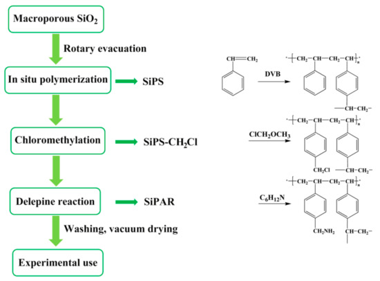 First, 40 g of SiPS was immersed in 120 mL of chloromethyl methyl ether and stirred at room temperature for 3 h. Next, 7.2 g of anhydrous zinc chloride particles was added as a catalyst in two batches and started reacting under agitation at 313 K. After 12 h, the products were filtered from the mixtures, then washed with alcohol and deionized water alternatively, and, finally, dried in a vacuum oven.