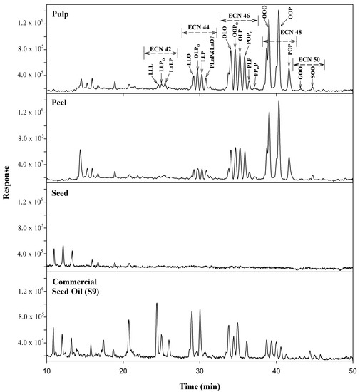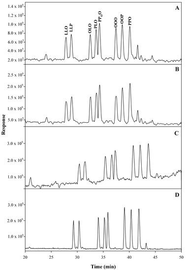 - Holcapek, M.; Lisa, M.; Jandera, P.; Kabatova, N. Quantitation of triacylglycerols in plant oils using HPLC with APCI-MS, evaporative light-scattering, and UV detection. J. Sep. Sci. 2005, 28, 1315–1333. [Google Scholar] [CrossRef]