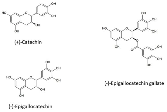 Catechins (monomeric flavanols) and their gallate derivatives are a class of flavonoids mainly present in fruits and vegetables and derived products like fruit juices or jams [1]. Monomeric flavanols are abundant in teas derived from the tea plant Camellia sinensis, as well as in some cocoas and chocolates (made from the seeds of Theobroma cacao) [2]. Catechins are also present in wine and are found in many other plant species. One gram of dried green tea leaves contain more than 200 mg catechins [3], although total catechin content varies widely depending on species, variety, and growth conditions. The main catechins present in green tea, as well as in black tea, are (−)-epigallocatechin (EGC) and the ester of epigallocatechin and gallic acid, (−)-epigallocatechin gallate (EGCG) [4,5]. (+)-Catechin is present in tea in minor amounts but is the main catechin in broad bean, black as well as white grape, plum, rhubarb, and raisins [6]. The food sources of catechins (tea, chocolate, apples, pears, grapes, and red wine) are very popular and highly consumed. Tea catechins consumed by volunteers at a total dose of 240 mg have been found to reach a concentration of up to 0.5 μM in blood plasma [7]. Consumption of eight cups of black tea every 2 h daily by volunteers has brought their blood plasma catechin level up to 1 μM [8].