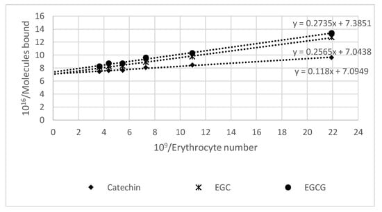 A series of erythrocytes suspensions in PBS were prepared (total volume 450 µL), and 50 µL of the solution of a selected compound (catechin, EGC, or EGCG) in PBS was added to obtain a final catechin concentration of 50 µM. Then, the samples were mixed and incubated for 1 h at room temperature (22–25 °C) with constant mixing. Finally, the samples were centrifuged (10 min, 5000 rpm), and the fluorescence was measured for 100 µL of selected supernatant mixed with 100 µL of DMSO (excitation 230 nm, emission 290 nm). The amount of catechins taken up was dependent on the amount of erythrocytes, and the reciprocal plots (plots of the (1/(number of molecules bound) as a function of 1/(erythrocyte number)) were linear. They were presented as 1016/(number of molecules bound by erythrocytes in the sample) vs. 109/(number of erythrocytes).