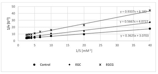 Lineweaver–Burk plot of erythrocyte membrane acetylcholinesterase activity in the absence and in the presence of 50 μM (−)-epigallocatechin (EGC) and 50 μM (−)-epigallocatechin gallate (EGCG).