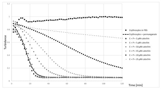 Aliquots of erythrocyte suspensions in PBS were mixed with selected catechin at a final concentration range of 1–25 μM (final volume of 200 μL) and incubated for 15 min with shaking at 37 °C. Then, 0.1 mM potassium permanganate (final concentration), as optimal concentration to induce hemolysis, was added, and turbidance (700 nm) was measured every 2 min for 120 min, with intermittent shaking.