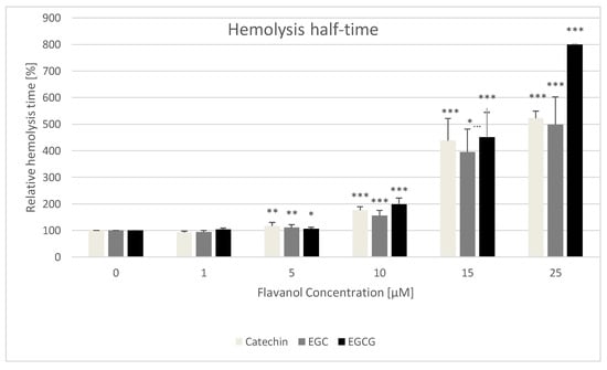 Effect of monomeric flavanols on the relative hemolysis half-time of erythrocytes. Half-time of hemolysis of control samples assumed as 100%. * p < 0.05, ** p < 0.01, *** p < 0.001 (with respect to control).