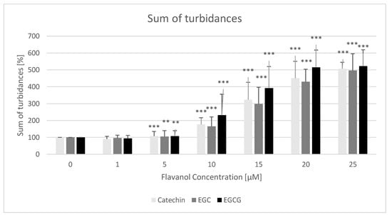 Effect of monomeric flavanols on the hemolysis of erythrocytes estimated from the sum of turbidance values during 120-min measurements (every 2 min). * p < 0.05, ** p < 0.01, *** p < 0.001 (with respect to control). Values for control samples were assumed as 100%.