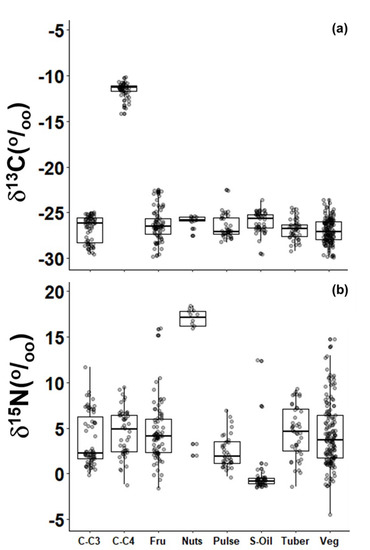 Then, according to the FAO classification, plants were grouped into C3-cereals, C4-cereals, fruits, pulses, tubers and vegetables. Except for C4-cereals, the average δ13C values of these groups ranged from −30.7 to −14.1‰ (Figure 2a). The main δ13C difference was between C4-cereals and the other plant groups (p < 0.01). On the other hand, δ15N values of oilseeds (−0.3‰) and pulses (2.4‰) were significantly less positive (p < 0.01) in comparison with other the groups. In addition, nuts (17.3‰) had more positive δ15N values (p < 0.01) than vegetables, tubers, fruits, and C3-cereals, whose average δ15N values varied between −4.4‰ and 15.9‰ (Figure 2b).
