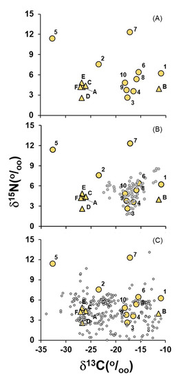 Biplot of δ13C vs. δ15N of: (a) plants (yellow triangle), and animal protein (yellow circle). A: C3-cereal; B: C4-cereal; C: fruit; D: pulse; E: tuber; F: vegetable. 1: beef; 2: bushmeat; 3: poultry; 4: egg; 5: freshwater fish; 6: lamb; 7: marine fish; 8: milk; 9: pork; 10: farmed fish (tilapia). (b) plants (yellow triangle), animal protein (yellow circle), processed food of animal origin (small grey circle). (c) plants (yellow triangle), animal protein (yellow circle), processed food of plant origin (small grey circle). In order to facilitate visualization, only processed foods with δ15N > 0‰ were included in (b,c).