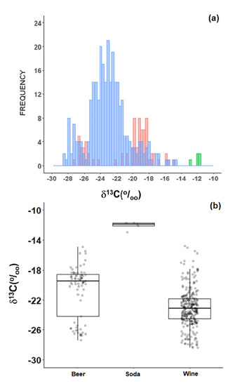 The average δ13C of wine samples was −23.1‰ (n = 291) with a wide range of values, from a minimum of −28.4‰ to a maximum of −14.8‰ (Figure 5a). The average δ13C of beer samples was −20.9‰ (n = 78), having a bimodal frequency distribution, with values concentrating around −27‰ and around −19‰ (Figure 5a). A few samples of soda were also analyzed just to confirm the heavy presence of sugar. The average δ13C of five soda samples was −11.7‰, with a standard deviation of only 0.5‰ (Figure 5b).