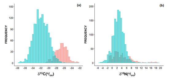 Frequency histogram of δ13C (a) and δ15N (b) of in natura plants used as food in Brazil. The green bars represent C4 plants, the blue bars represent CAM plants, and the red bars represent C3 plants.
