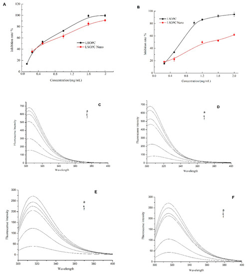 Inhibition effects of LSOPC and LSOPC Nano on monophenolase (A) and diphenolase (B), respectively. Fluorescence spectra of l-tyrosine in the presence of different concentrations of LSOPC (C) and LSOPC Nano (D). Fluorescence spectra of l-3,4-dihydroxyphenylalanine (l-DOPA) in the presence of different concentrations of LSOPC (E) and LSOPC Nano (F). (a)–(f): 0, 25, 50, 100, 250, and 500 μg/mL.