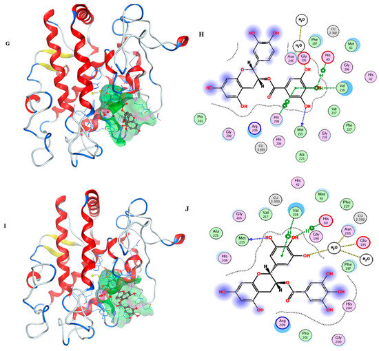 Ligands are shown as grey, site residues are shown as blue, copper ions are shown as yellow. (A) binding conformation of LSOPC dimer binding to the tyrosinase; (B) molecular contacts between LSOPC dimer and amino acids of tyrosinase; (C) binding conformation of compound CC binding to the tyrosinase; (D) molecular contacts between compound CC and amino acids of tyrosinase; (E) binding conformation of compound EC binding to the tyrosinase; (F) molecular contacts between compound EC and amino acids of tyrosinase; (G) binding conformation of compound EGC binding to the tyrosinase; (H) molecular contacts between compound EGC and amino acids of tyrosinase; (I) binding conformation of compound EGCG binding to the tyrosinase; (J) molecular contacts between compound EGCG and amino acids of tyrosinase.