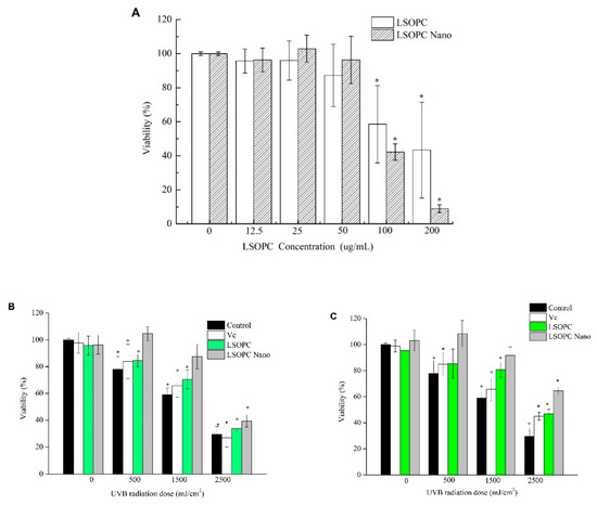 Cytotoxic effects of different concentrations of LSOPC and LSOPC Nano (A); protective effects of Vc, LSOPC, and LSOPC Nano on human foreskin fibroblast cell (HFF-1) after ultraviolet B (UVB) irradiation; the concentrations of Vc, LSOPC, and LSOPC Nano were as follows: (B) 12.5 μg/mL; (C) 25 μg/mL. * p < 0.05.