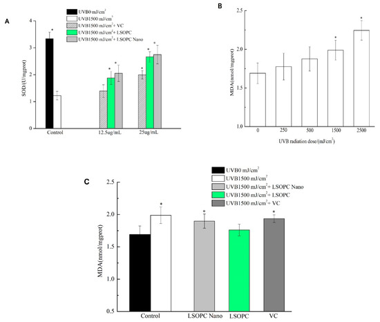 Superoxide dismutase (SOD) in HFF-1 cell before and after UVB irradiation with different concentrations of LSOPC, LSOPC Nano, and Vc, respectively (A); malonaldehyde (MDA) in HFF-1 cell under different doses of UVB radiation (B); MDA in HFF-1 cell before and after 1500 mJ/cm2 UVB irradiation with LSOPC, LSOPC Nano, and Vc (12.5 μg/mL), respectively (C). * p < 0.05.