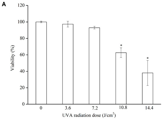 Even though the direct damage of UVA to skin is less than UVB, the penetrating power of UVA is stronger. Exposure to UVA irradiation affects the corium layer, particularly the internal formation of collagen. According to Figure 6A, cell viability progressively decreased as the intensity of UVA irradiation they were exposed to was increased. For instance, the cell viability decreased to 97.3% after exposure to 3.6 J/cm2 of UVA irradiation and to 38.0% after exposure to 14.4 J/cm2. For the subsequent experiments, a UVA irradiation of 10.8 J/cm2 (62.7% cell viability) was selected to treat the samples.