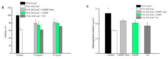 Cell viability of HFF-1 after different doses of UVA irradiation (A); protective effects of Vc, LSOPC, and LSOPC Nano on HFF-1 cell after 10.8 J/cm2 UVA irradiation (B); hydroxyproline formation before and after 10.8 J/cm2 UVA irradiation with LSOPC, LSOPC Nano, and Vc (12.5 ug/mL), respectively (C). * p < 0.05.