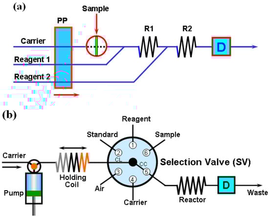 Diagram of a flow injection analysis (FIA) (a) and a sequential injection analysis (SIA) system (b) [19] (PP—peristaltic pump; R1, R2—reaction coils 1 and 2; D—detector).