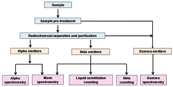 The overall procedure for radionuclide determination is presented schematically in Figure 2. Most gamma emitters can be directly measured by gamma spectrometers after suitable sample preparation (e.g., homogenization and packing). For alpha and beta emitters, so-called difficult-to-measure radionuclides, the analytical procedure can be divided into four steps: initial sample pretreatment, chemical separation/purification, source preparation and detection. Different approaches utilized in each step and their connections with flow approaches are discussed in the context with relevant examples taken from published articles.