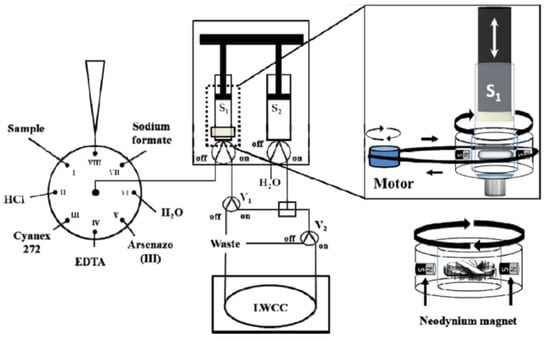 Schematic depiction of a flow system incorporating lab-in-syringe liquid–liquid microextraction (LIS-LLME) with magnetic stirring assistance (MSA) for radionuclide determination [47]. LWCC: liquid waveguide capillary cell, V: solenoid valve, S: syringe.
