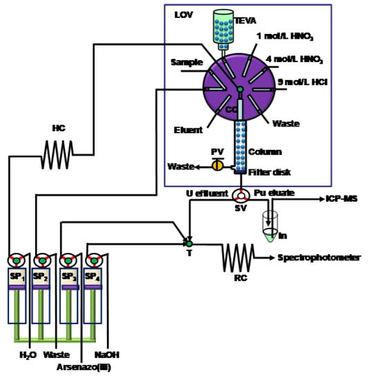 A hyphenated LOV-MSFIA system, coupled to a long path length liquid waveguide capillary cell (LWCC), performed spectrophotometric determination of U and Th in different types of environmental samples [45]. Online separation of U and Th is carried out in a UTEVA column, which is automatically regenerated within the LOV platform. Following the separation, U and Th are spectrophotometrically detected after reaction with arsenazo-III.