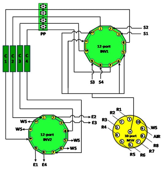 Schematic deposition of a flow system for four sample simultaneous processes [92]. SV: selection valve.
