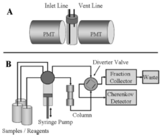 Schematic deposition of a flow-system-coupling Cherenkov detection flow cell configured between dual photo-multiplier tubes (PMTs) [37].