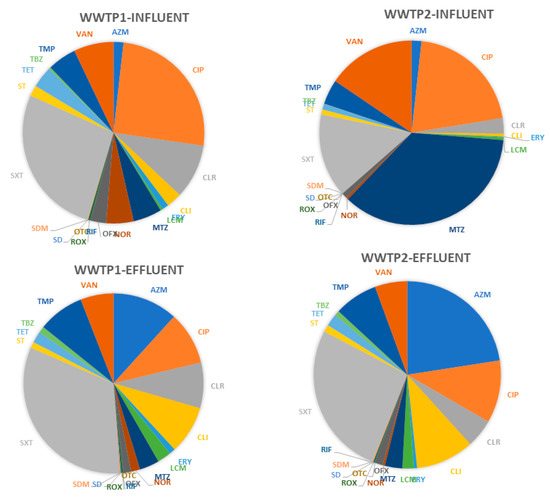 The concentrations of 26 antimicrobials in effluents from WWTP1 and WWTP2 are shown in Table 1. In effluents from both WWTPs, the highest average concentrations were observed for azithromycin (up to 650 ng/L), sulfamethoxazole (up to 770 ng/L), ciprofloxacin (up to 312 ng/L), and clindamycin (up to 290 ng/L). In effluent from WWTP2, a higher mean concentration of azithromycin but lower of metronidazole was observed. The percentage contribution of the analyzed antimicrobials in influent and effluent of both WWTPs are presented in Figure 1. To summarize, among antimicrobials tested, ciprofloxacin and sulfamethoxazole were the most dominant antimicrobials in influent and effluent from both WWTPs.