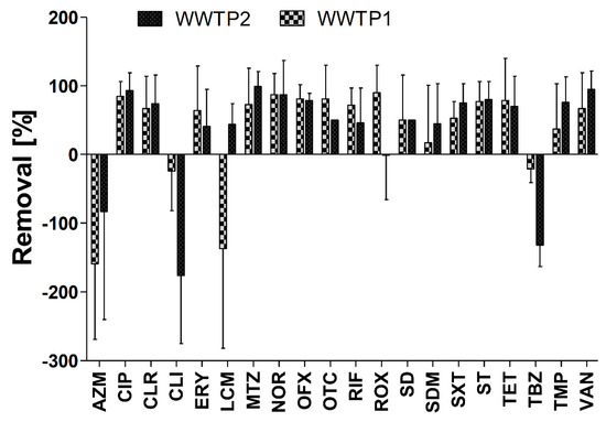 The removal efficiency (calculated based on equations described in Section 3.3) of tested antimicrobials was similar for both WWTPs (p > 0.05). The average removal efficiency was above 50% for 12 and 10 out of 20 detected antimicrobials for WWTP1 and WWTP2, respectively (Figure 2). Among the antimicrobials from the sulfonamide group, four were detected in effluents and their removal rate ranged from 17% to 80% with an average of 52%. Certain inconsistencies exist in literature about sulfonamide removal, as per the review by Le-Minh et al. [37]. Some researchers have reported an effective removal of sulfonamide [38], although others have mentioned the opposite results [39]. Based on the literature data, this fact might be explained by the differences in operational conditions of each WWTP.