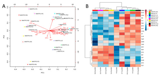 Differences in antimicrobials’ concentrations between the wastewater, sludge samples, and leachate collected from WWTP1 and WWTP2. Principal component analysis (PCA) of the all samples (A). Variables of a data matrix are represented as arrows. Visualization of the observed relations on the heat map (B). ES, excessive sludge; FS, fermented sludge; In, influent; LS, leachate; Out, effluent; PS, primary sludge; RS, residual sludge.