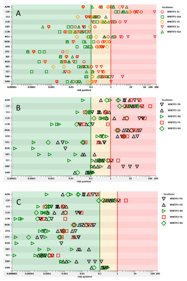 The risk factor of antimicrobial resistance selection (named as antimicrobial resistance risk, defined as preferential outgrowth of antimicrobial-resistant bacteria) in wastewater was high for the following antimicrobials: azithromycin, ciprofloxacin, clarithromycin, metronidazole, and trimethoprim (Figure 4A). As expected, this factor was the highest in influent from both WWTPs. Similar results were obtained by Ostman et al. [24], who observed a high risk of resistance selection in influents in Swedish WWTPs because of the prevalence of ciprofloxacin and metronidazole. No risk for azithromycin was detected in their study.
