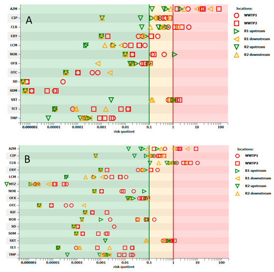 Estimation of risk quotients of chronic exposure of cyanobacteria (A) and eukaryotic organisms (B) to the antimicrobials occurring in effluents and receiving water. Calculations were based on the measured concentration of antimicrobials in wastewater and PNEC calculated based on [27]. Risk quotient below 0.1 indicates minimal risk (green area), between 0.1 and 1 is medium risk (orange area), and over 1 is high risk (red area).