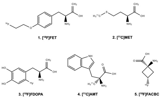 Radiolabeled amino acid tracers (Figure 1) are of great interest in brain tumor imaging because of the high tumor-to-brain contrast based on the relatively high specificity for neoplastic tissue and the low uptake in healthy brain tissue [7,8,21,31,32,33].