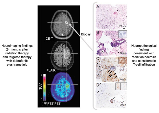 Radiation necrosis and chronic inflammation in a patient with brain metastases of a B-Raf proto-oncogene (BRAF)-mutated malignant melanoma who had been treated with whole-brain radiation therapy combined with concurrent dabrafenib plus trametinib. Twenty-four months later, the contrast-enhanced magnetic resonance imaging (MRI) indicates a recurrence of the brain metastases (left panel), whereas the O-(2-[18F]fluoroethyl)-L-tyrosine ([18F]FET) positron-emission tomography (PET) shows only insignificant metabolic activity and is consistent with the findings of treatment-related MRI changes. Neuropathological findings (right panel) after stereotactic biopsy show signs of radiation necrosis as well as considerable T-cell infiltration. (A) Hyaline, eosinophilic necrosis with evidence of a necrotic vessel wall (arrowhead). (B) Vital brain parenchyma besides necrosis with activated microglia cells (arrowhead), and blood vessels with lymphocyte infiltrates (arrows) without evidence of tumor cells (inserted box). (C) Adjacent to inflamed blood vessels (arrows), a resorption of necroses by macrophages (block arrows) as well as activated microglia cells (arrowheads) and astrocytes in the brain parenchyma (inserted box). (D) The main population of intra- and perivascular T-cell infiltrates are CD3+ (arrow), but also CD4+ (inserted box left) and CD8+ (inserted box right) T-cells contribute to the infiltrates (modified from Galldiks et al. [10], with permission from Oxford University Press).