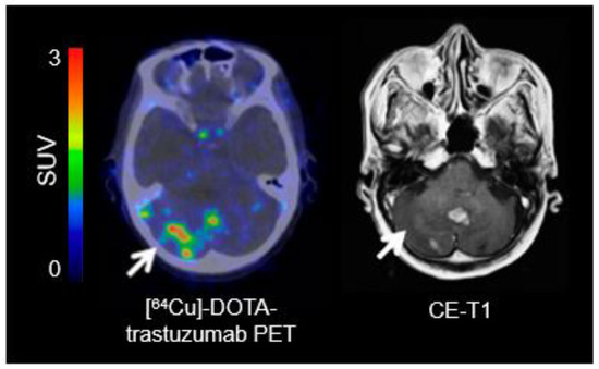 [64Cu]-DOTA-trastuzumab positron-emission tomography (PET) and contrast-enhanced magnetic resonance imaging (MRI) performed one day after initiation of treatment with trastuzumab in a patient with a human epidermal growth factor receptor 2 (HER2)-positive breast cancer with brain metastases. In single brain metastases, [64Cu]-DOTA-trastuzumab PET helps to improve lesion detection (arrow) (modified from Tamura et al. [160], with permission from the Society of Nuclear Medicine and Molecular Imaging).