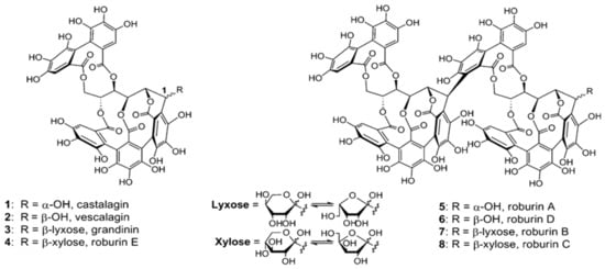 Structure of eight ellagitannins present in oak wood. Figure adapted from Jourdes et al. [].