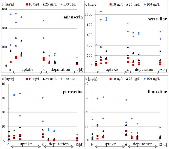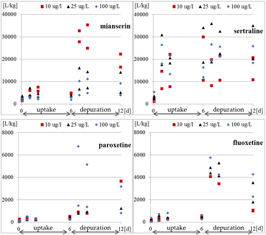 Whole-body internal concentrations based on the parent compound were measured. The concentrations of the compounds inside the protozoa and in the medium were determined four times in each research phase. The results of the concentration of the tested antidepressants in S. ambiguum cells and in the medium are shown in Figure 2 and Table A2, while the BCF values are presented in Figure 3 and Table A3. From the internal concentration data, it can be concluded that uptake and elimination kinetics vary greatly between the tested pharmaceuticals. S. ambiguum accumulated significant amounts of sertraline and mianserin, but different bioaccumulation scenarios were observed in each case and for each drug concentration. The concentration of sertraline in the protozoan cells increased gradually during the uptake phase for low and medium drug concentration. For the highest level tested, the highest sertraline concentration was determined after 24 h, followed by a gradual decrease in its concentration. In the depuration phase, the sertraline intracellular concentration remained at a high level, falling by only 40% of the highest concentration (all tested concentrations). Mianserin reached its highest concentration in S. ambiguum cells after two days of incubation. After six days, its level dropped to 60–70% and then gradually decreased in the depuration phase. Fluoxetine and paroxetine were not accumulated inside the protozoan cells, and their BCF values during the uptake phase never exceeded 1000 L/kg, while for mianserin and sertraline, the BCF values reached much higher at 4939 and 34,092 L/kg, respectively. The U.S. Environmental Protection Agency has established a BCF ranging from 100 to 1000 L/kg to indicate a medium concern for bioaccumulation [13]; compounds with BCF > 1000 L/kg are considered to be highly bioaccumulating.