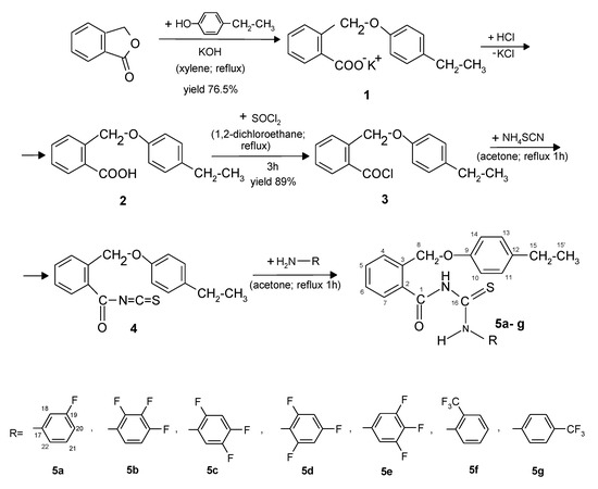 - Limban, C.; Missir, A.V.; Chiriţă, I.C.; Niţulescu, G.M.; Ilie, C.; Căproiu, M.T. Some new 2-(4-ethyl-phenoxymethyl)benzoic acid thioureides: Synthesis and spectral characterisation. Rev.Chim. (Bucharest) 2009, 60, 657–661. [Google Scholar]