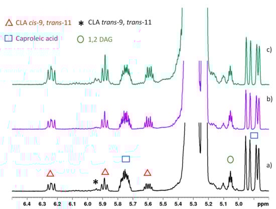 The minor components identified were CLA, caproleic acid (C10:1 cis-9), diacylglycerols (DAGs), linoleic acid, and linolenic acid. CLA is a class of PUFA constituted by a mixture of geometric (cis-cis, trans-trans, cis-trans, and trans-cis) and positional (6–8 to 13–15) isomers []. From the analysis of the unsaturated region reported in Figure 2, CLA was prevalently present as the cis-9, trans-11 isomer (also named rumenic acid), confirmed by the characteristic pattern of signals and 3J coupling constant, while in minor amount as the trans-9, trans-11 isomer. In addition, caproleic acid was detected due to its specific pattern of signals, specifically as a multiplet at 5.75 ppm and as a double quartet at 4.94 and 4.88 ppm.